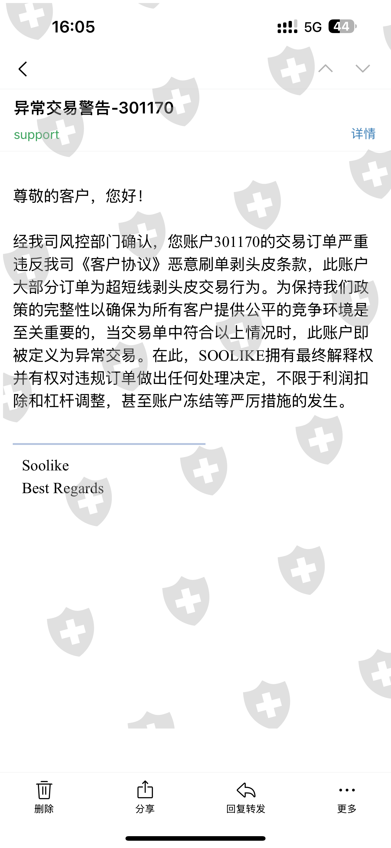 4月初在该平台入金3000,获得400赠金,平台要求45天内完成21手后就能转换赠金。本人在6月中旬完成要求后申请把赠金转换成本金,该平台一直拖到7月11号都没有完成赠金转换,因此也不能出金剩余本金。在7月8号平台客服承诺7月11号完成赠金转换,可我在7月11号当天却收到平台邮件说我之前的交易存在恶意刷单剥头皮,赠金不给予转换甚至有冻结账号可能,本人给平台发邮件问询哪天的哪单存在违规,平台也不给予回复,此平台吃香非常难看一拖再拖就是不给出金!