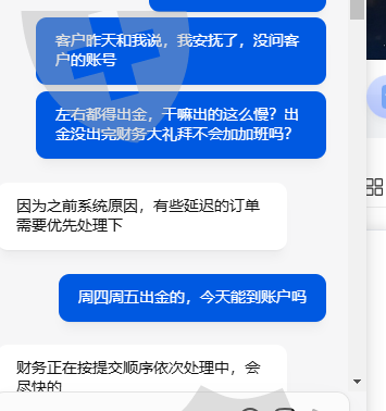 2005.7.11日周五出金,到今天16号,多次和客服沟通未到账的事宜,回复和财务沟通了,尽快尽快处理,尽快就是这样处理的?做外汇也10多年了,试问有这么慢的出金平台吗?是不是平台出问题了?让人质疑!