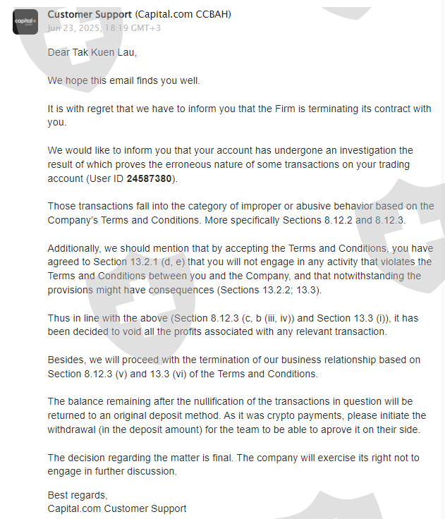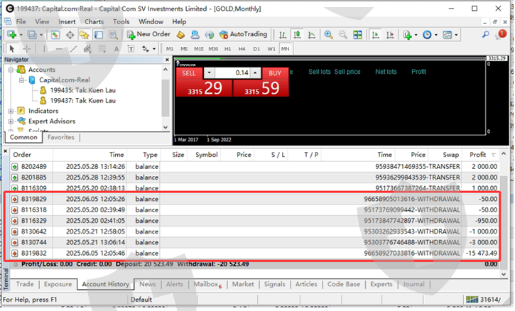 黑平台,小心!!输钱就正常交易,盈钱就说交易不正常。2025年5月20,申请出金18,523.49 美元,Capital.com 拒绝出金。MT4 账户199435、199437 已经扣钱,但没有汇出金额。