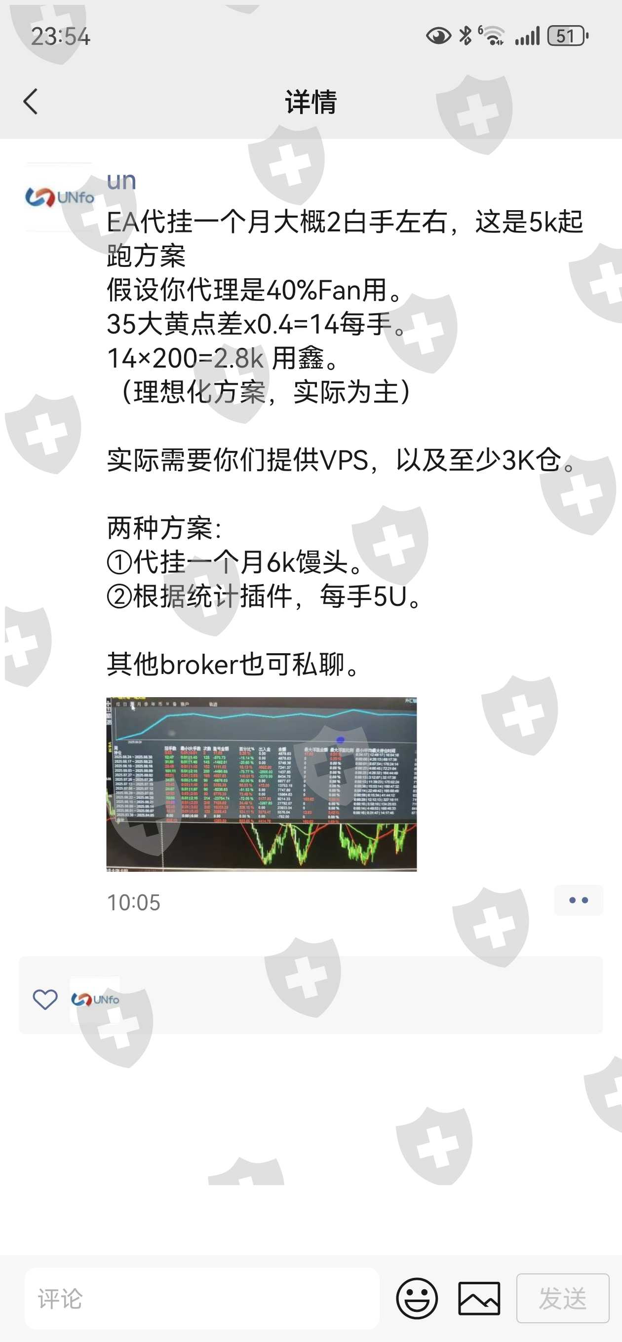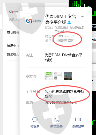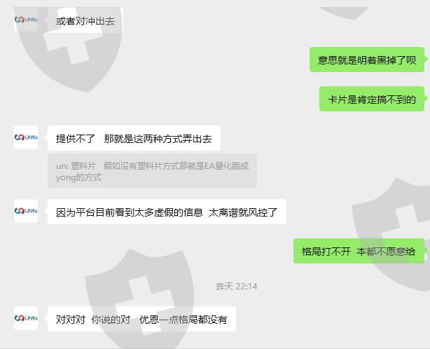 真吃人不吐骨头,最后还被那个代理恶心一下。大家对接un的代理微信大部分应该一个人,因此判断这个代理跟交易所肯定有很强的关联,绝对是拿了我们入金的多少走了。代理首先说明是允许外部对冲,另外一个账户一个月可以申请一次。这边弄了20多个账户玩,上周五开始就不给出金,反正他们就说能用银行卡出,说收到解除风控的邮件就给出卡。我相信一周过去你们都没收到这种邮件。代理朋友圈发的也就自己截图了一张,应该是想让拖住大家,我这卡了一万多u,我试发了邮件过去说只需出本金即可,依然得不到回应,妥妥的诈骗。所以大家要团结起来。绝不能让诈骗分子逍遥法外,今天晚上还在发也是一个专业卡钱的ut交易所叫玩,这个代理绝对拿了我们很多血汗钱,现在交易所那边先看看天眼这边能否帮忙追回,重点的突破口是在代理这,他是肯定有直接分到我们的钱。绝不让这种不法分子逍遥法外。代理最后的时候还是想着要割大家一把的。给了两个方案,你可以对别的交易所打到另外那边去,或者给他交费,一个月6000,那边有ea量化刷单,然后拿返佣回本。最后那句回复看看,着实被恶心到了。下面附上聊天记录以及账户。有渠道能找出此人信息的可以联系起来。切记以后此人避而远之。