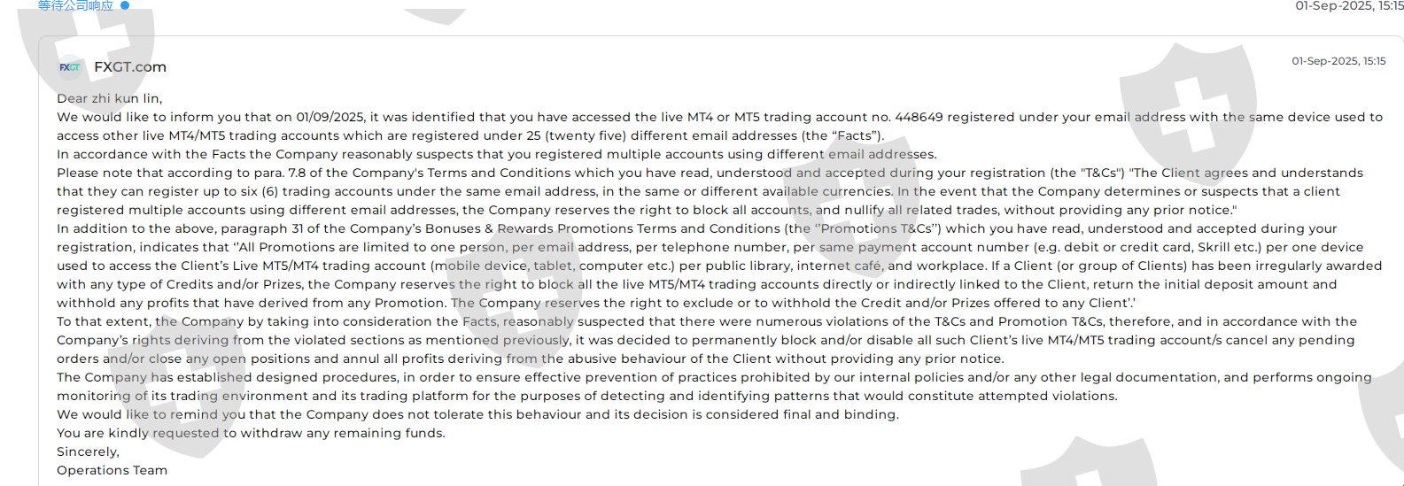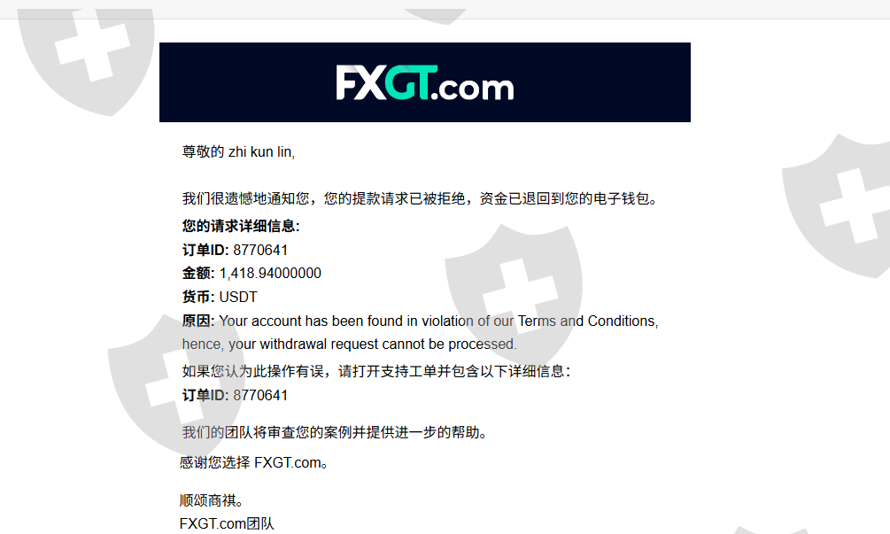 FXGT平台出金申请遭拒