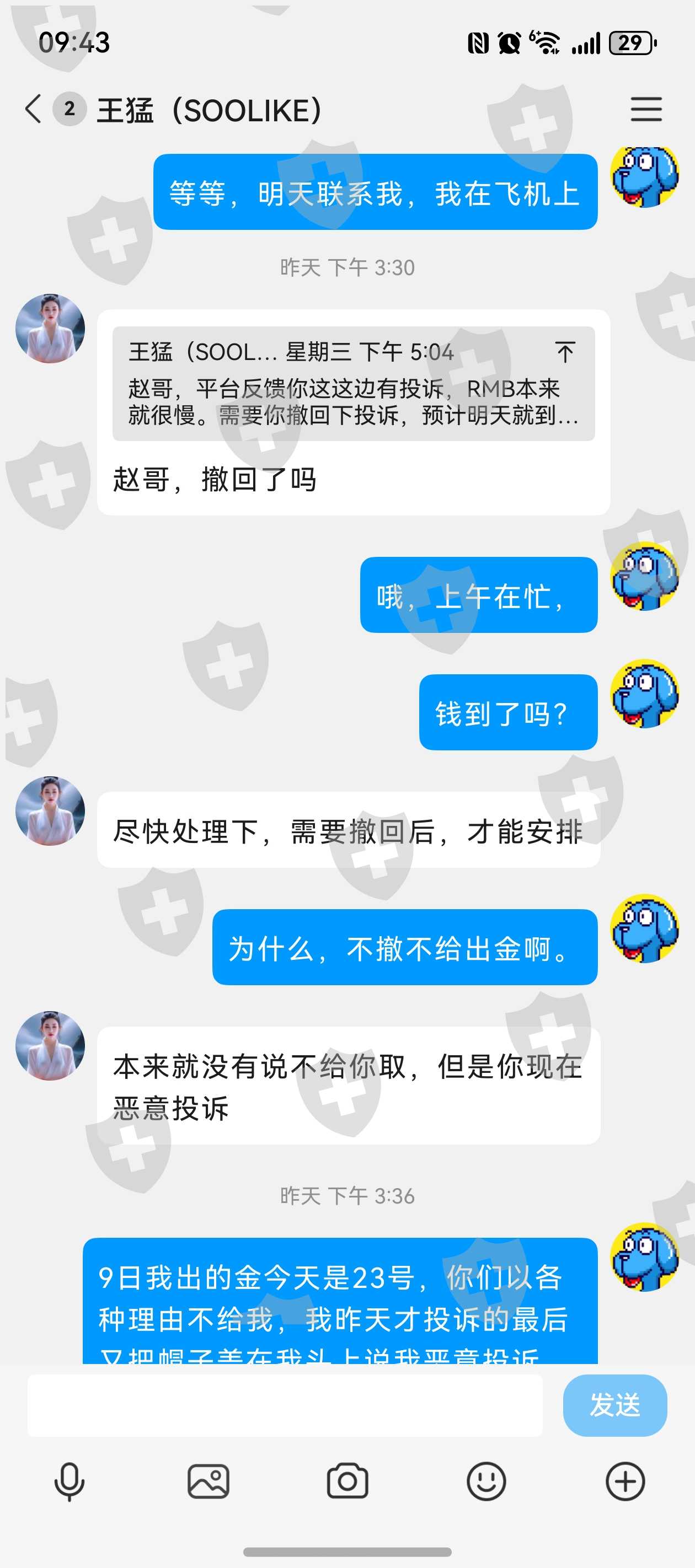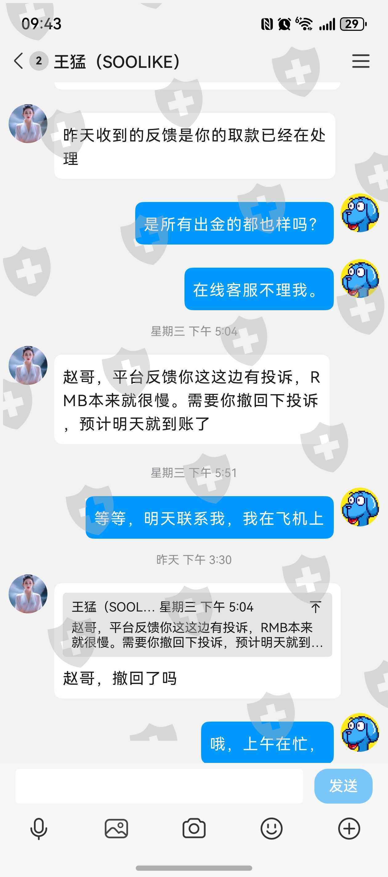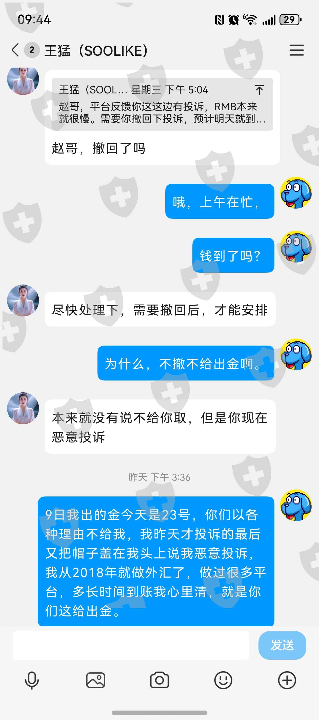 22日中午,我在外汇天眼投诉,一直不理我的客服下午5点多就联系我,说我投诉了平台只要我撤诉23日就能到账,还说出金就是慢,等二天,我问为什么没到账他却把责任都推到我身上是因我恶意投造成的,9日出金到22日中都不给到账,只要一撤诉第二天就承诺到账,你们说这平太正规吗?能用吗?大家千万可别上当。