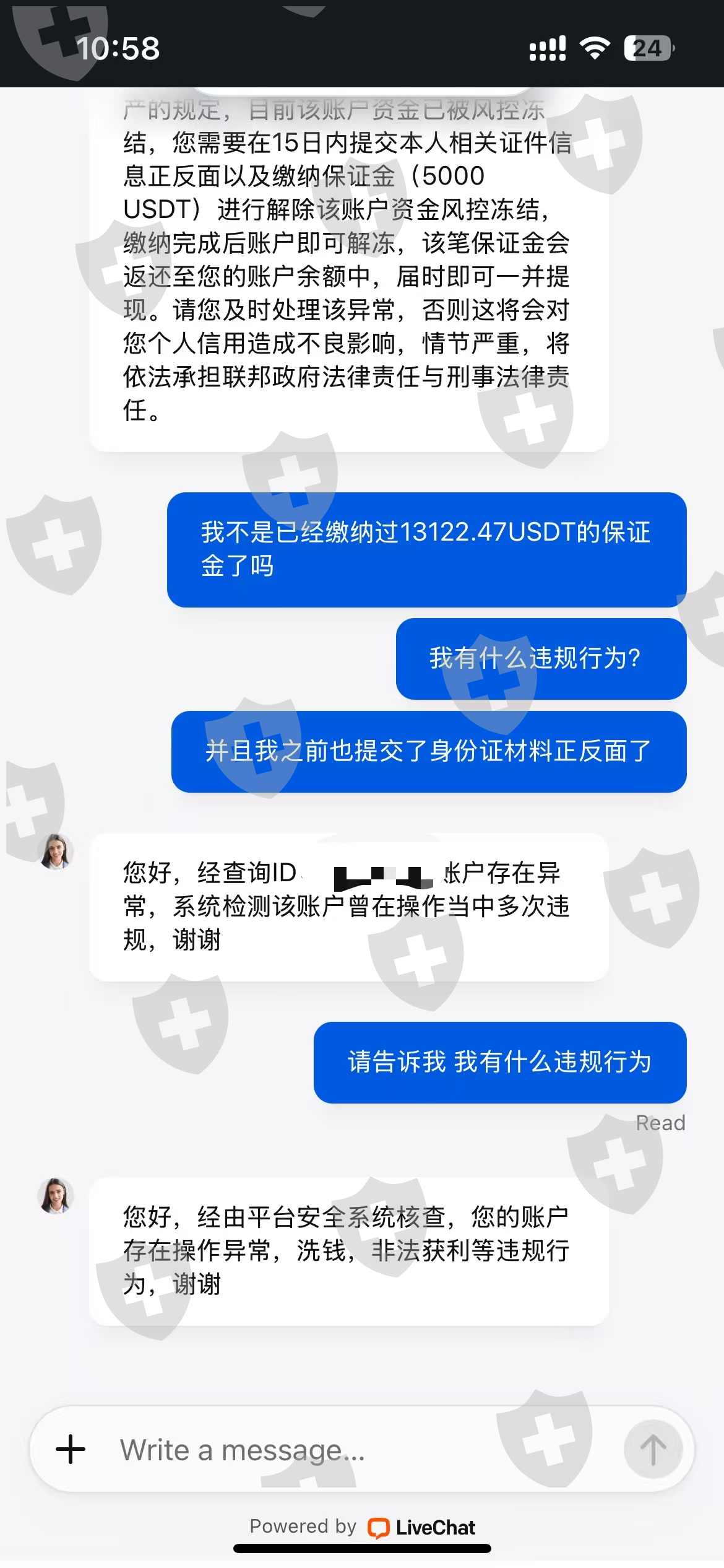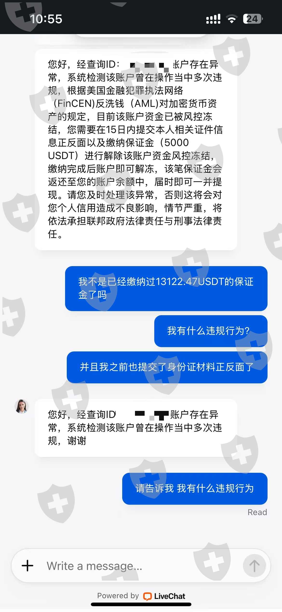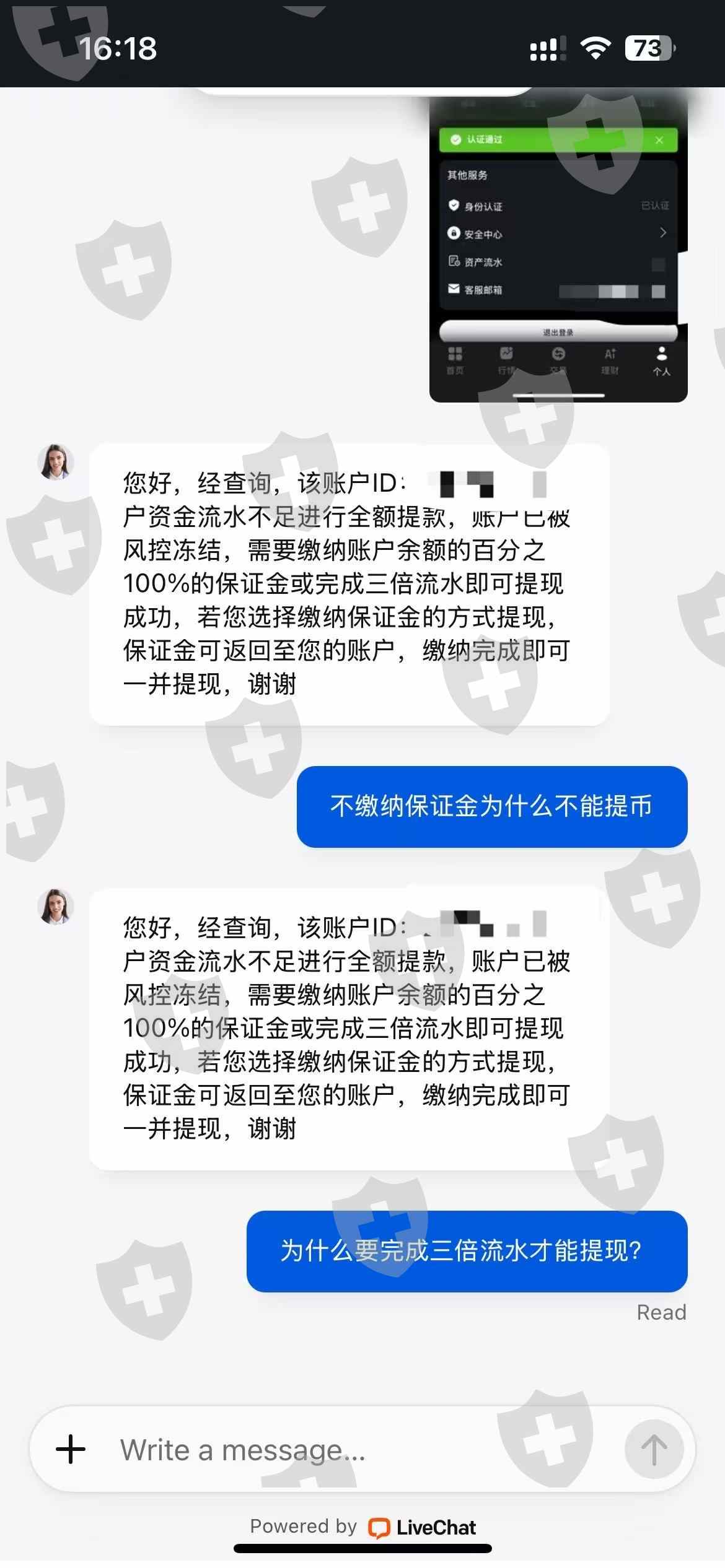 根本就不能出金 大家避雷这个app,一直让你缴纳保证金, 我账户里原本有13122.47美元,我提币说我的流水不够三倍,需要在七天内缴纳13122.47💲的100%的保证金,我在规定的时间内缴纳了13122.47💲,然后又提币还是不能提出来共计26244.94💲,现在还需要我在15天之类缴纳5000💲,说我不在规定的期限内缴纳5000💲的保证金就要永久冻结我的账号,估计缴纳了5000💲我依旧不能提币,并且已经冻结了我的账号!