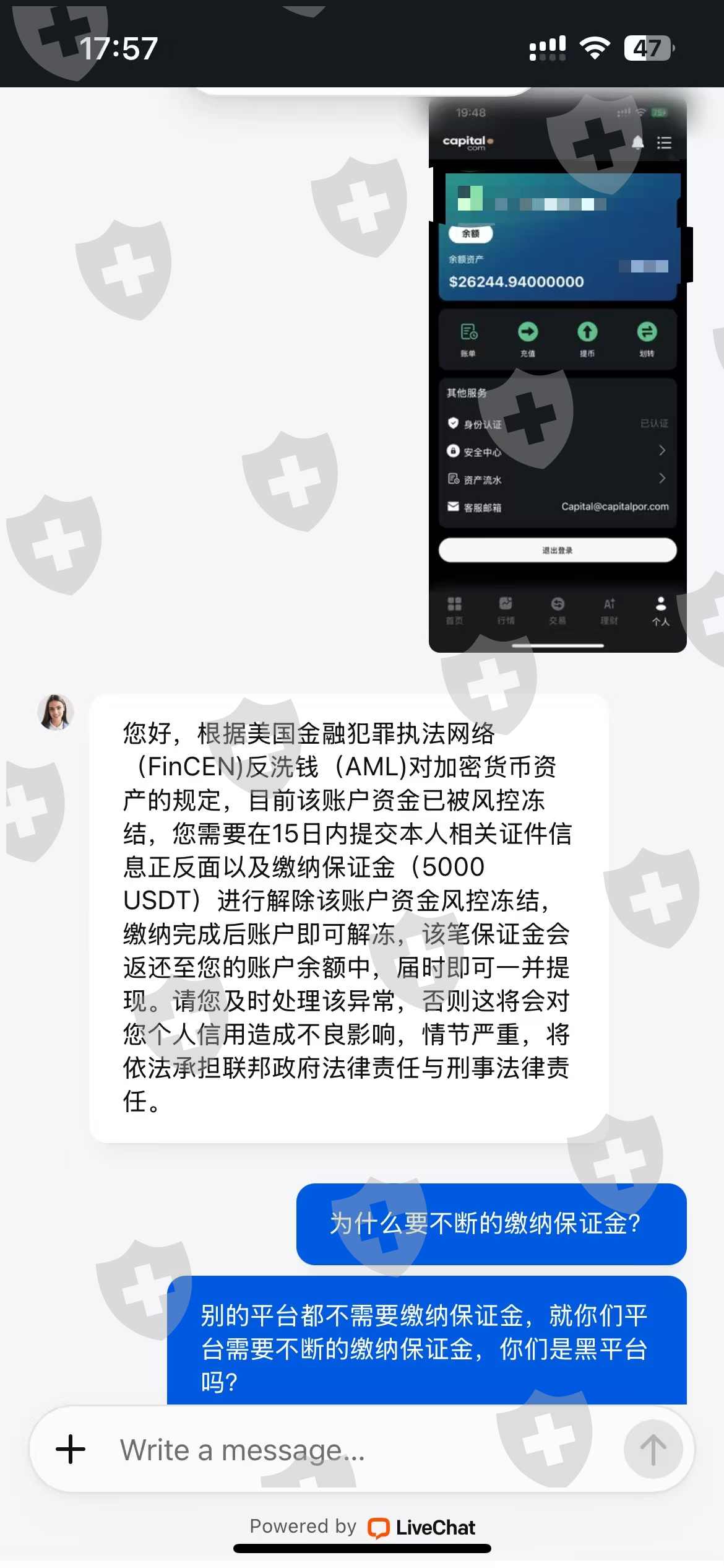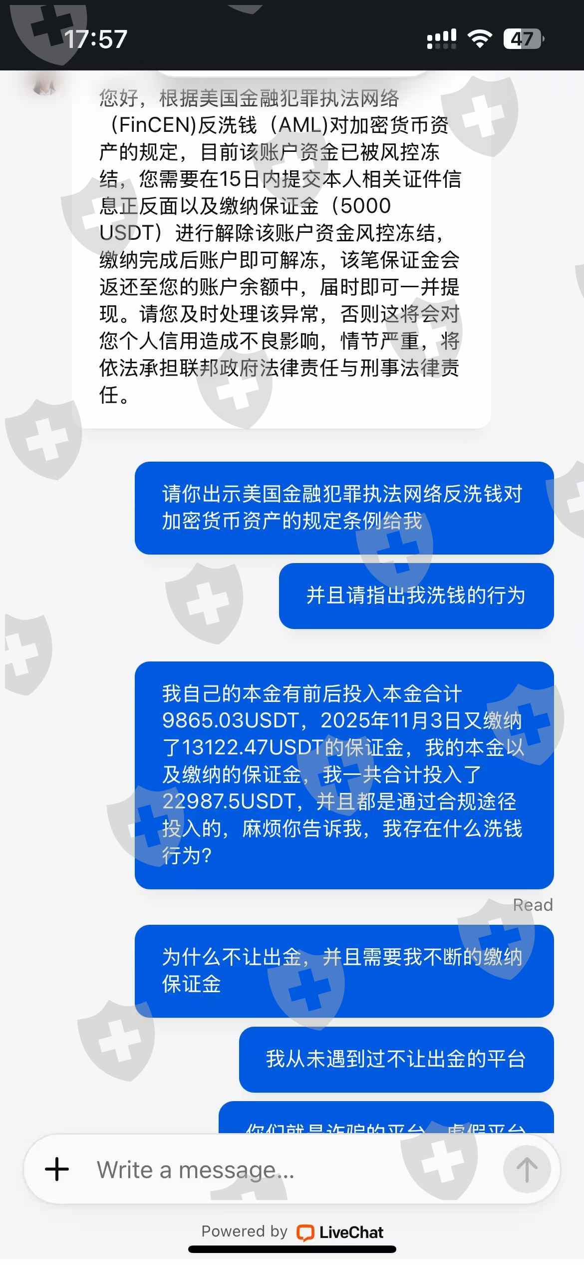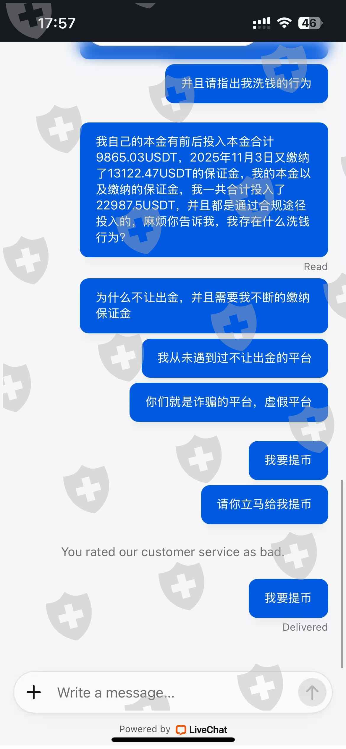 无法出金,需要不断的缴纳保证金,并且客服也不正面回复问题,第一次提现是2025年10月27日以流水不足三倍为由拒绝提币需要我缴纳保证金,第二次提币为2025年11月4日以洗钱为由拒绝我提币并且需要我再次缴纳5000USDT的保证金,总之就是不让出金,还会冻结我的账户,我一共投入了22987.5USDT