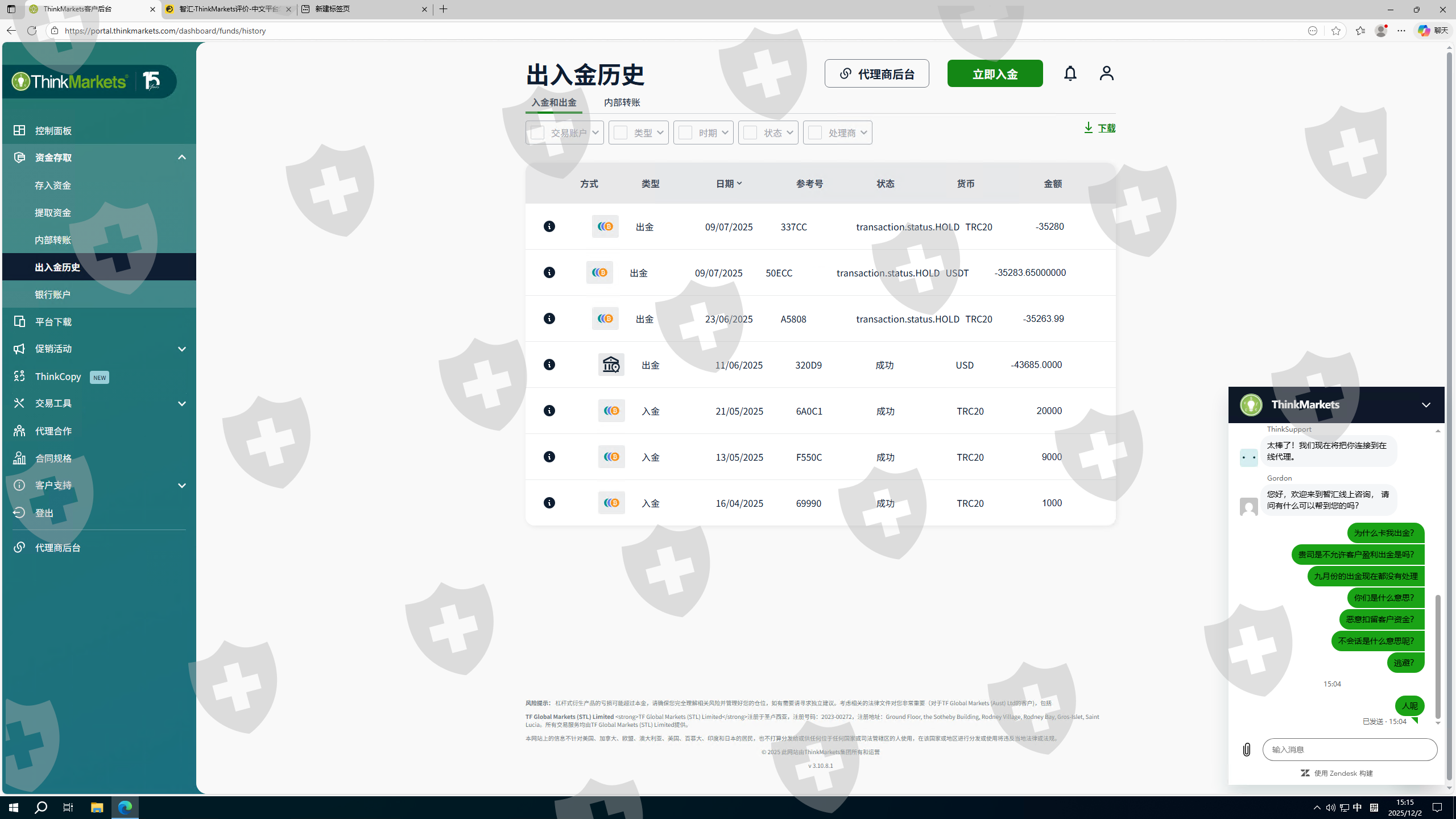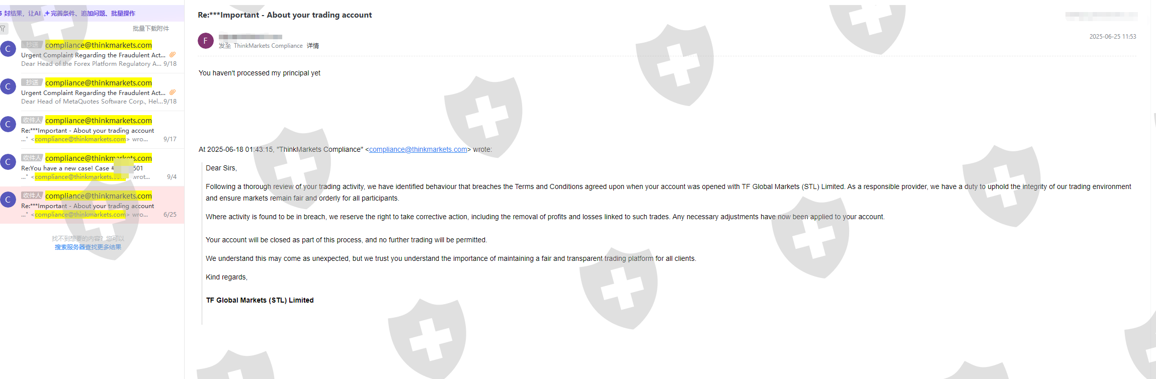 今年4~5月份入金了30000USD,在2025年6月10日,由于单边行情,我的账户产生了收益,随之不久后我收到一封来自thinkmarkets平台的邮件,声称我参与了非法活动,并通知我他们将调整账户余额并关闭我的账户!他们不仅仅扣除了我全部利润43,685USD,我尝试出金本金30000USD三个月以来一直不予处理!三个月以来我多次联系智汇平台索要我的本金和利润,该平台都是置之不理,没有任何反应!我甚至投诉了监管,他们是黑平台,根本不会被合法监管,大家千万不要来这个平台!!!!