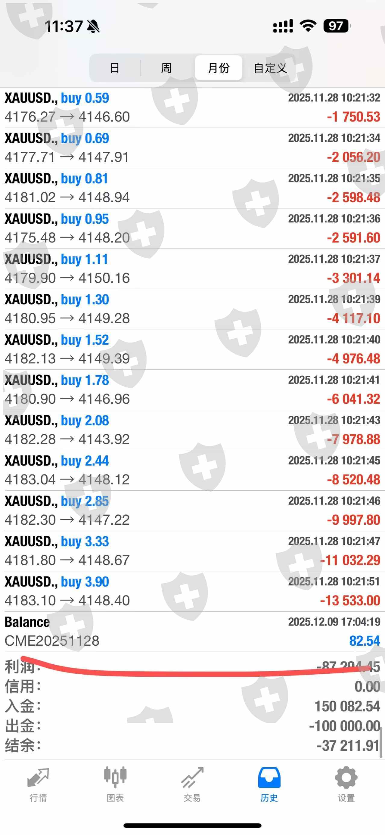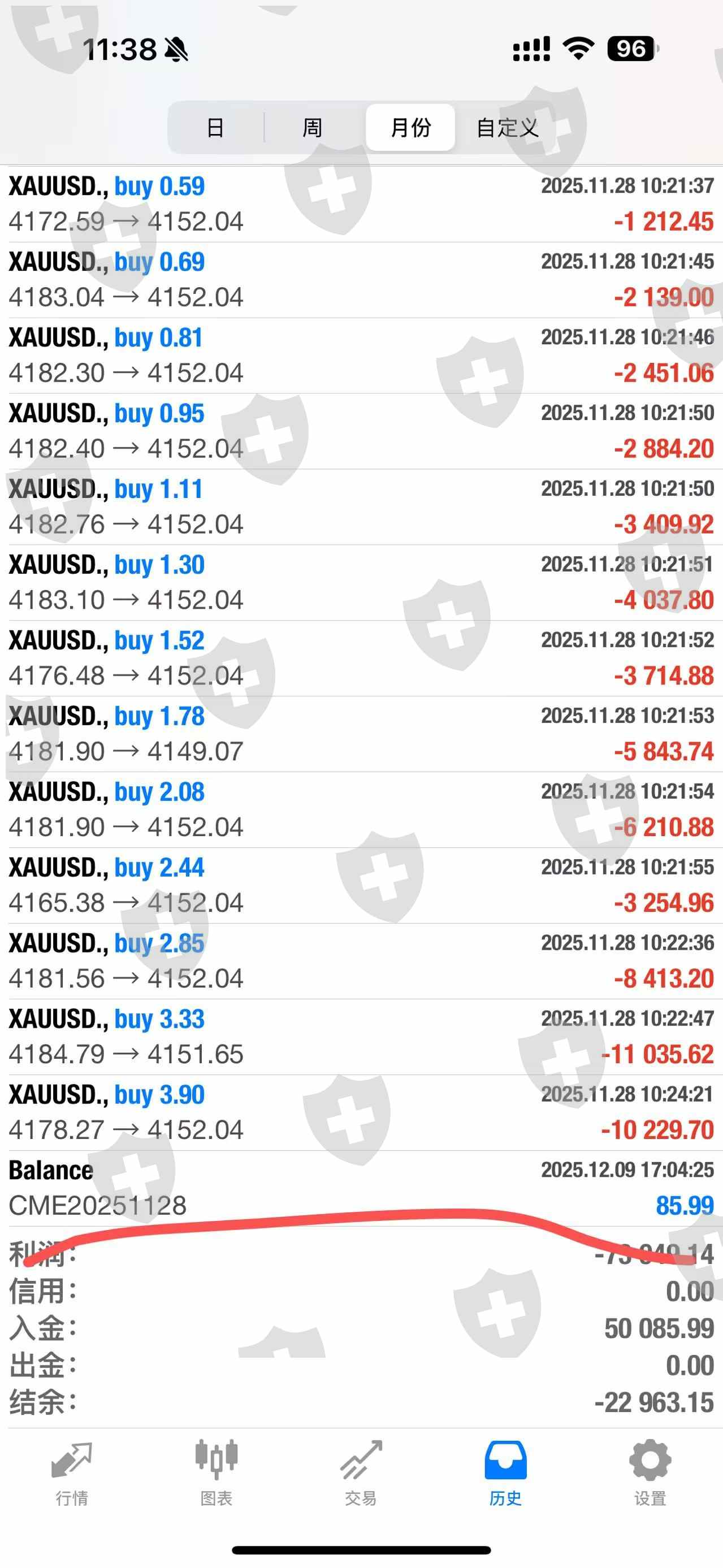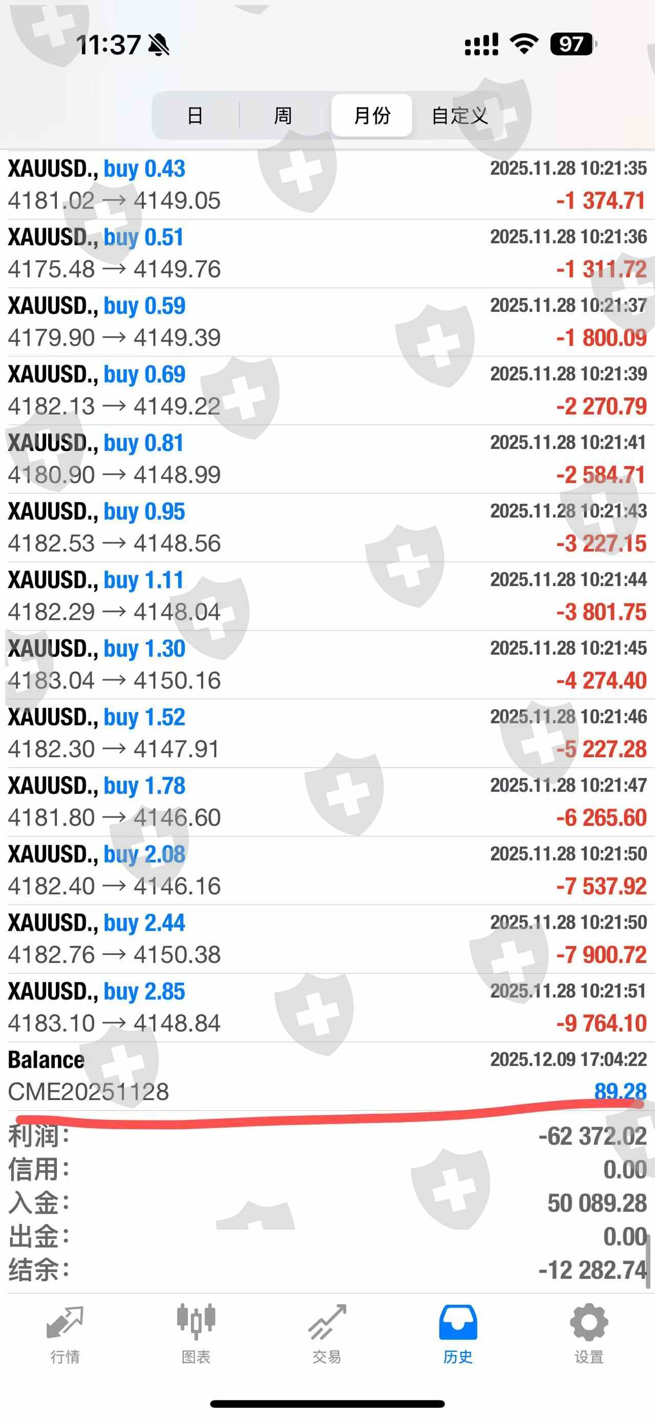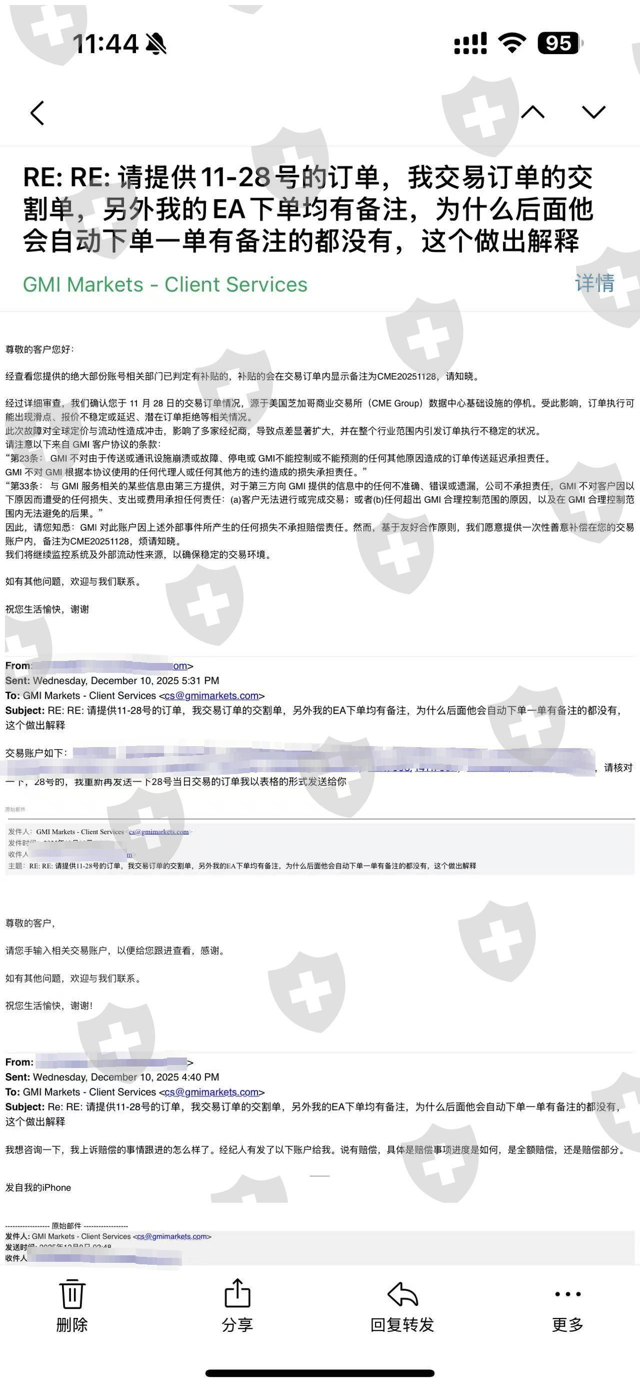 11.28号当天下午交易所宕机,出现点差无限扩大化,做市商非但没有维护好市场的交易环境反而无限扩大点差,把我的账户全部干爆仓,我第一次玩这个居然就遇到这种的事情。而且平台不作为,跟代理沟通了,代理说还在跟上面平台方沟通赔偿的事情,但是时间一天天过去,迟迟没有回复,没办法我只能选择投诉进行维权。代理还跟我说,平台那天的决定居然是后台入金cme1***的入金金额这个作为赔偿,这个一共赔偿的如图85美分,82美分,89美分,这个作为赔偿?赔偿了还不如不赔,打法要饭吗?打进来还不够抵扣穿仓的钱,这个不是左手倒右手?有意义吗?搞包吃的吗?另外还说平台只赔27号过夜的订单到28号的,你这不搞笑的吗,28号的下午4.14分就发生的事情,你拿27号的来说事情,这个合理吗,27号发生的。什么事情都是你们自己说的算,那我们投资人用户一点话语权都没有呗?GMI还我血汗钱。。另外宕机的当天交易的订单是否流量交易所,请提供我的交割清单也没有提供不出来,都没有网线了,怎么流,被你们无限扩大点差内部系统干爆仓了,干包吃了。还推卸责任说是cme交易所的稳提,券商的责任义务是维护好交易环境,确保订单顺利打向交易所。而不是出现问题一直在这那的。请各位领导为我们散户主持公道。把钱还我我不玩了,一共1500美金。