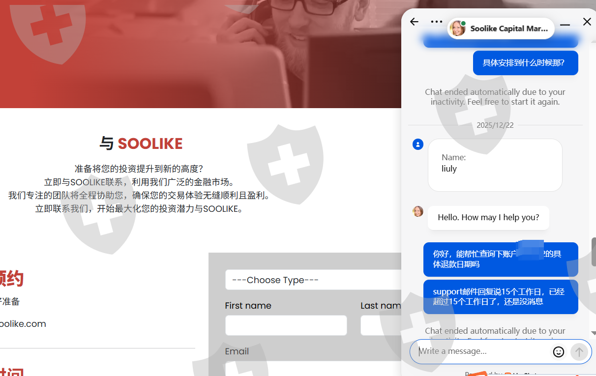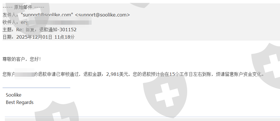 SOOLIKE在11月份取消合作,并邮件答复:您账户3****2的退款申请已审核通过,退款金额:2,981美元,您的退款预计会在15个工作日左右到账,烦请留意账户资金变化。当前已经20多个工作日了, 但是当前还没收到退款,发给平台的咨询退款邮件也没有任何答复。希望平台尽快安排退款