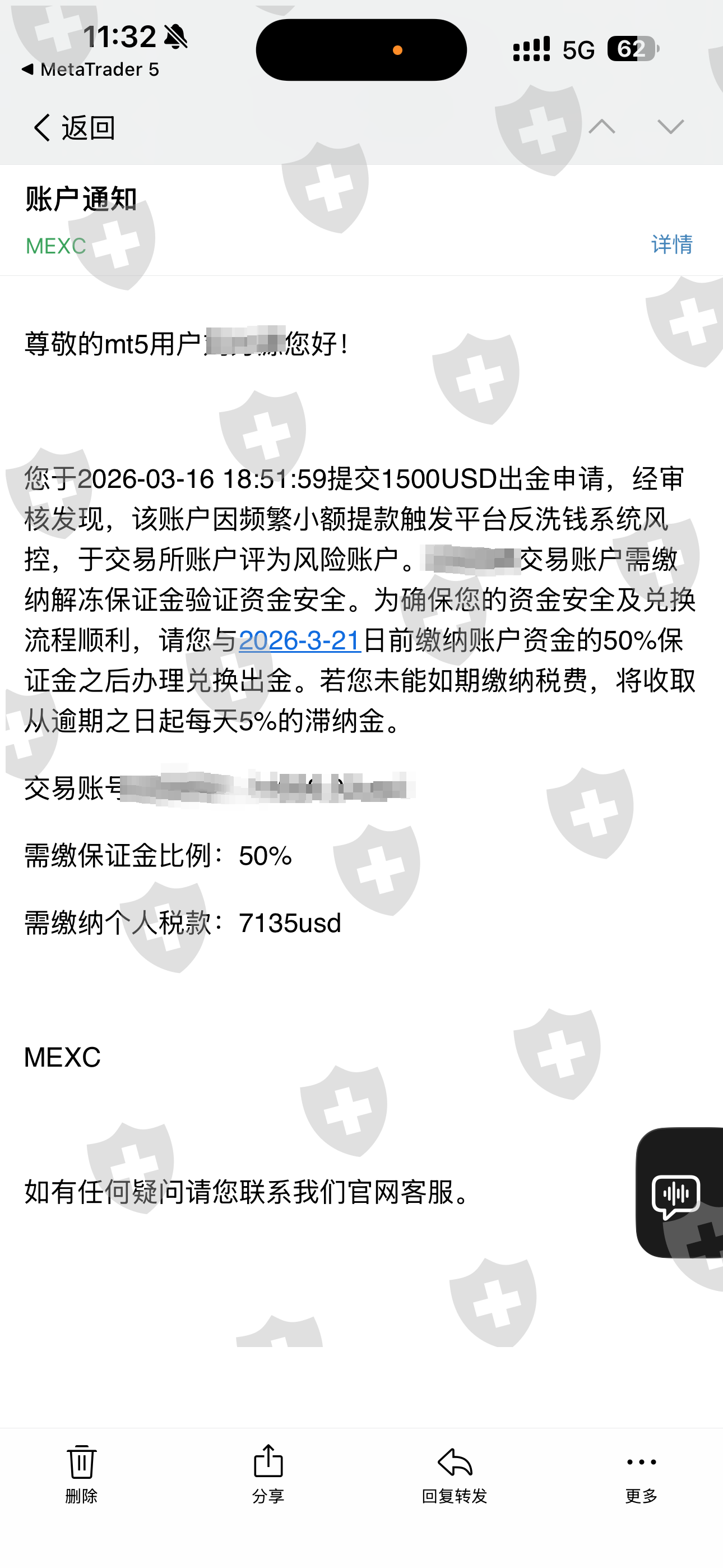 我是跟他们的合作商那里开的户,存了6200美元,然后前几次还能出金,后面就不让我出金了,说我出金频繁涉嫌洗钱的嫌疑,我一个正常投资者,洗钱有那么小的金额吗,然后现在又给我发了个邮件让我缴纳百分之50的保证金,上午还把我的账户给封禁了。
