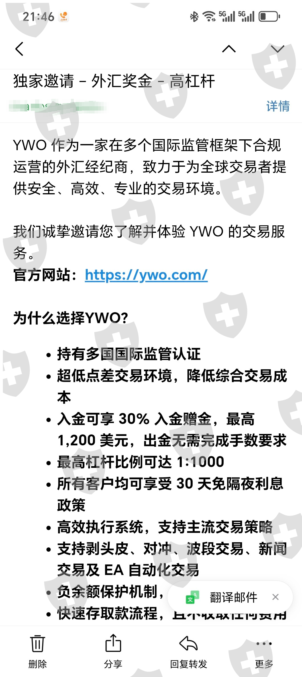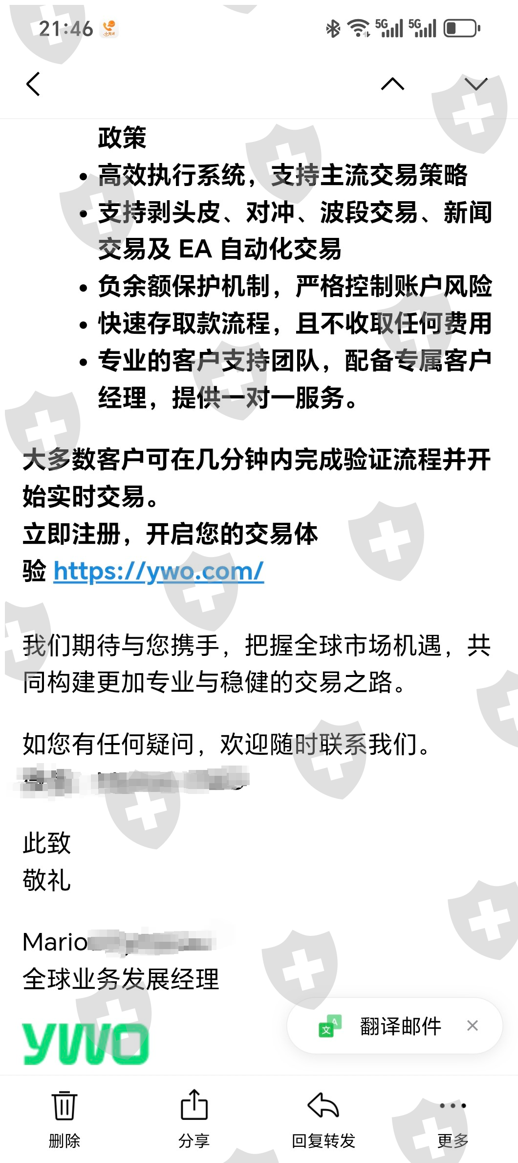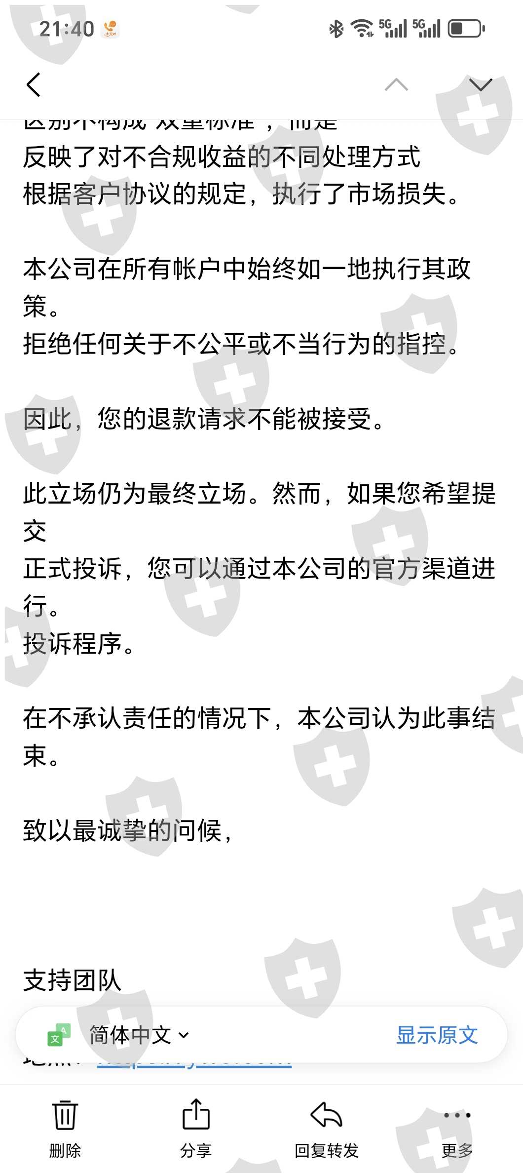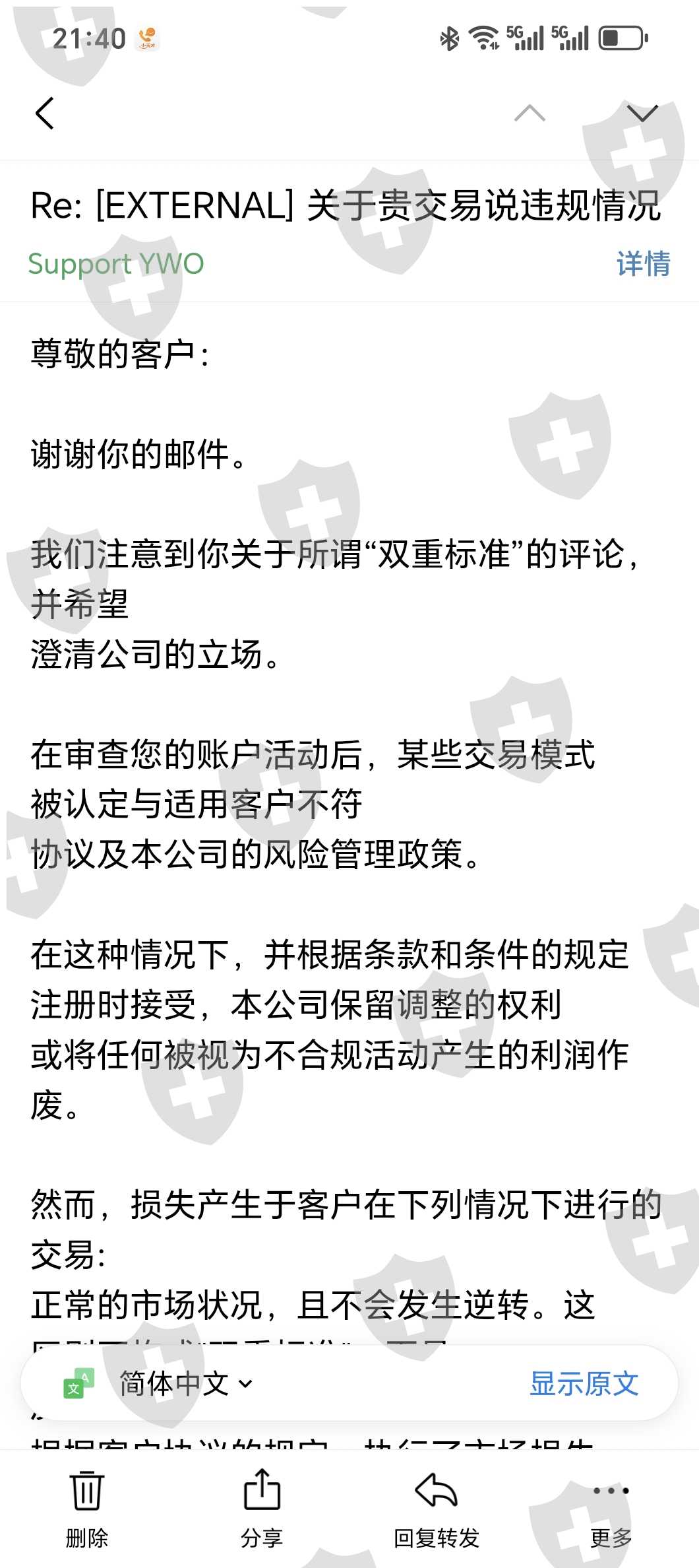 YWO 收到下图邮件,觉得平台怪牛的。 代理安排我和其他三个投资者入金,我的交易账户:亏损2000美金,三个就一个投行盈利了。他入金多抗住了。现在平台说他盈利违规直接扣除,我就想既然同一时间段同一交易策略。单子要违规就都违规不违规就都不违规,申请要回我的2000本金,平台来一句我的是正常的。哈哈笑了,盈亏通杀,这盘牛逼。