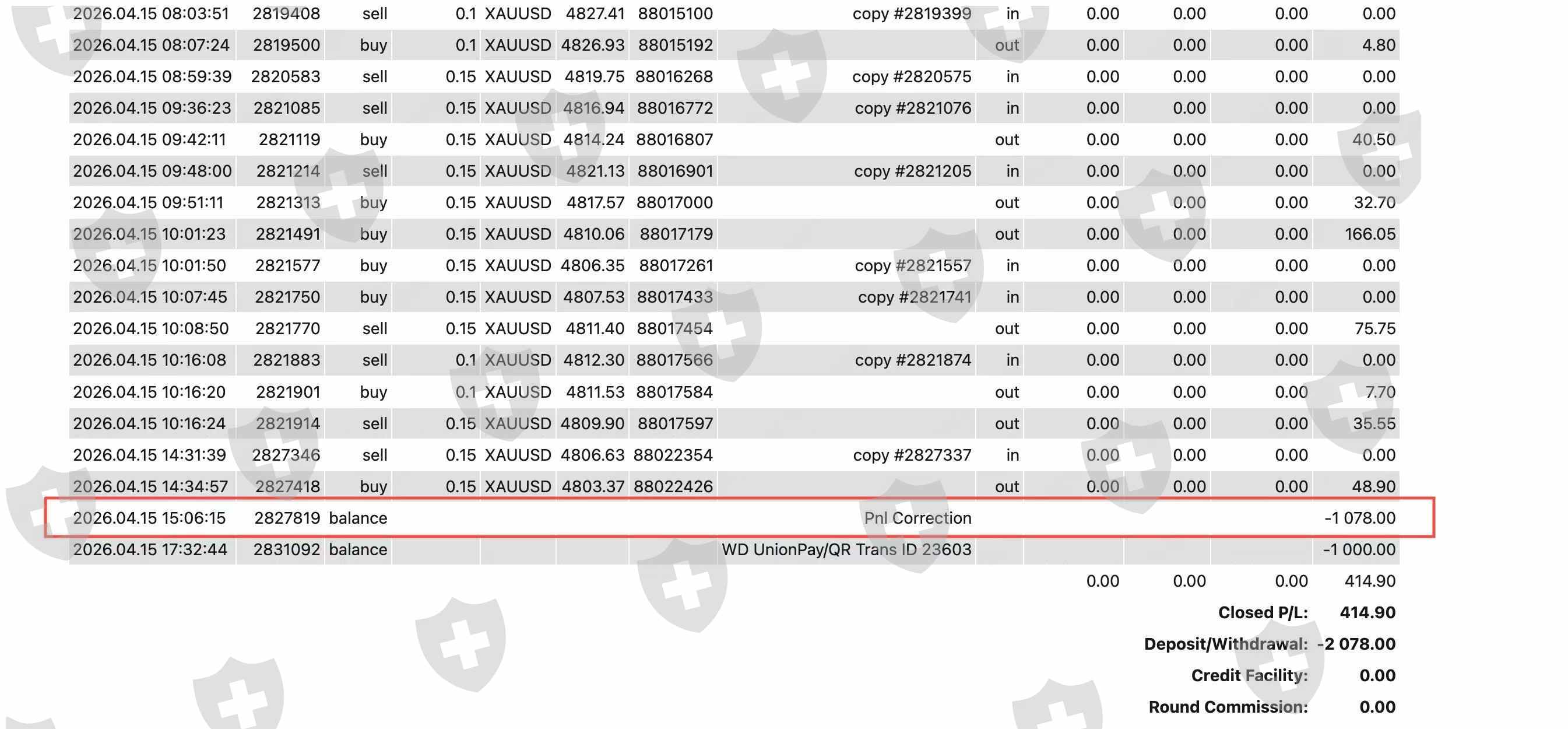 运气好,跟单赚了 1078 美金的利润。当我要申请出金时,平台直接撕破脸!他们先是在后台发了一张日结单,通过一笔名为 “PnL Correction”(盈亏修正) 的操作,直接把我账户里的 1078 美金利润全部扣除(见图2红框)。