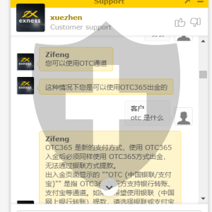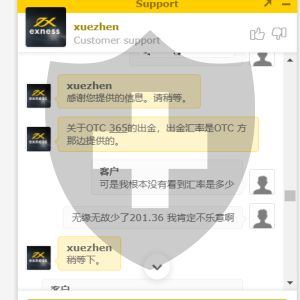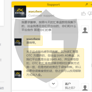 Exness 回复塞浦路斯客户12月3日使用OTC365方式出金,当时OTC平台即时汇率低于银联汇率。客户收到的出金款项相对减少。我们平台本身无法控制第三方出金通道的规矩,希望客户在出金前即时查询。针对客户的投诉我已经向OTC方面申诉,有结果了客服会立即通知客户