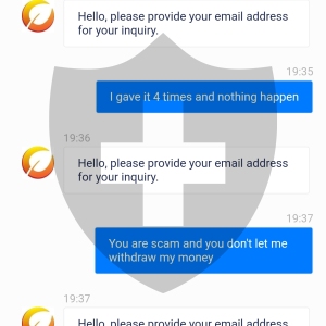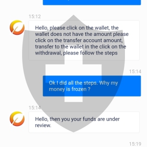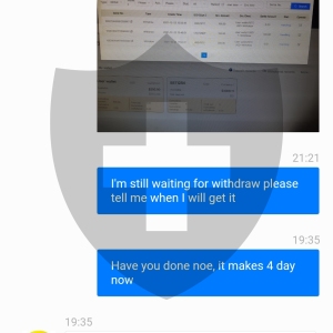 在完成我的帐户并产生利润后,我决定出金这笔钱。我询问出金步骤,他向我解释说。一旦交易结束,我的资金会被冻结,他们告诉我能够发送到我的btc地址是正常的。我等了12个小时,我的 btc 钱包仍然没有收到任何东西。我要求解释,他问我要我的电子邮件然后我等待了更长时间。 3-4 天后,我发了几条消息,但没有回复。最后,消息是自动回复的