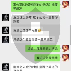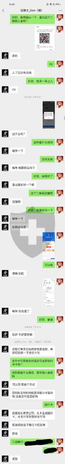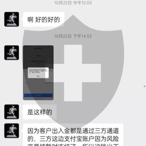 最后一次入金时候代理商告知通过支付宝二维码进行入金操作,当时按照流程完成1万元人民币扫码支付。当支付完成后代理商告知入金支付宝被冻结,导致支付交易的资金不能正常到达平台以交易,之后被告知支付宝解冻后可以继续正常入金或者采取出金操作。个人采取了出金,代理商又告知冻结时间大概为2周,之后可以正常出金,但目前事情已过2个月时间,依然未能正常收到退款。现在直接联系不到那个代理人,怀疑圈钱跑路了。目前恳请平台方给予及时回复及得到对应帮助,感谢!(后附相关截图以做证明)下面有那个代人的微信和当时他说入金用的支付宝付款码