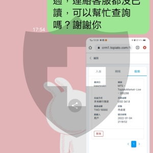 想要出金可是客服中心都沒回應,只有說要過年後才能出金,如果要出金不然就要補繳稅金,可是我朋友有匯錢去給對方,還是等不到對方的承諾,還是無法出金。以下都是跟同一個投顧投資的標的,都等不到回應,無法出金。
