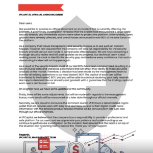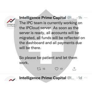在iprime capital交易商的任何人都无法提取他们3周内的每周交易利润或Mt4交易本金。首先是该公司解雇其营销团队。然后他们告诉我们存在安全漏洞,他们承诺会解决它..但直到现在我们还无法出金。他们还让我们都使用特定的机器人(master c bot)来锁定我们的资金90天。所以现在没有人可以提取他或她的资金..即使机器人仍然每天交易,我们也无法提取它,因为它甚至没有掉入或 usdt 钱包它只是从我们的交易资金中消失了 3 周,现在我们没有'不知道发生了什么,ipc 只是一直说他们正在 ipcloud 中工作,但仍然没有发生任何事情。无语。自上次更新 ipcloud 以来。为什么我们不能出金。这整件事是骗局吗?