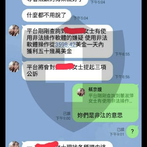 平臺商後續開始追討超額虧損,並威脅恐嚇說不給錢就要訴諸法律,各種惡毒語言盡出。完全不承認造假報價的過程,硬要說這是正常滑價(從44000滑到30000?)。請大家注意這家平臺商,此平臺用非法人頭帳戶入金,用Line群帶操作,先以小額出入金獲利,再以互利為理由,誘使大家高額入金,抽成..後面手段為何不得而知~