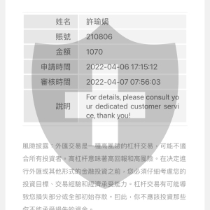 本人2022年4月初通過shenghui group ltd 註冊入金在MetaTrader5交易,交易帳號210806。2022年4月6日申請出金被拒絕。客服也沒有回應
