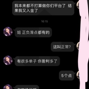 此平台交易的每一个单子都处于滑点中,大多数都是零点几个点,我就不在乎了,每天都会有,不管行情大小他都滑点,平常2-5个点的滑点,特别是今天直接来了一个5个点的滑点 我就觉得不可思议。 找他们在线客户呢?也是说找客服经理,找客服经理呢 ,就一直说滑点正常 滑点正常我想知道2-5个点吃客户的钱 这也叫正常?