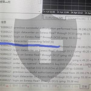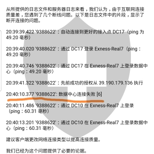 4月14日晚下单后出现平台断开连接,无法交易,K线图停滞情况,持续约十分钟后恢复,本来盈利四五个点,随着欧元一波下跌变成亏二三十点以上,严重影响正常交易。后向在线客服反映,要我通过邮件发送日志等材料,回复邮件称平台服务器没有发现问题,其他客户没有反映中断情况,我认为这只是他们平台单方面说法,因为其他人无从得知,不是有效证据。我百度查了mt4连接失败,说是平台服务器不稳定导致,后又打客服电话和发邮件反映,平台方始终是推脱责任态度,说我这边网络问题,但又给不出确实充分证据。事实上我这边一直能正常连接上网。对于日志中的数据中心(服务器)连接失败,也没给出合理解释