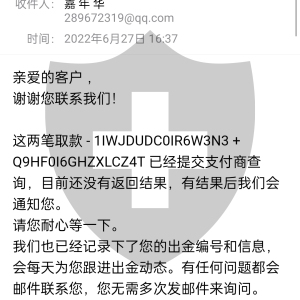 6月20日出的金,都两个星期过去了,还没到账,客服说是支付商积压的出金单子比较多,我每天都跟客服沟通,只能打文字沟通,也可以通过他们的客服电话回拨沟通,这两天客服电话也沟通不了了,说是电话网络问题,这个平台太不靠谱了,2个星期都不给出金
