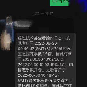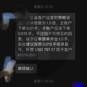 在mam系统中跟单设置了1.5倍跟单,当开始跟单时主账户下0.01手,子账户前两单以1.5手进行跟单导致爆仓,之后系统又自动恢复成0.01手跟单,平台一开始说给补偿,后来又说不给补偿,在没有任何有效证据的情况下断定是我跟单时设置错误,然后发给我两张不清楚还打着马赛克的图片,就说是我的设置记录,如果我设置过固定手数1.5倍跟单,那么mam系统中一定存在设置记录并且无法删除的,根本没有那条错误的设置记录,平台故意推卸责任,甚至恶意篡改导致我爆仓,有黑平台的作风。