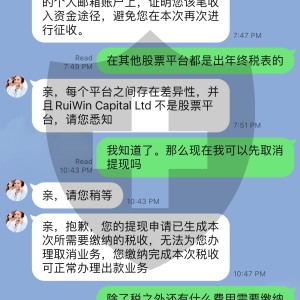 本人在微信上认识某人,通过他在Rui Win Capital LTA 交易商在MT5平台进行黄金期货交易至2月11日2022. 总共盈利加入金的金额为$233902, 2-11-2022我想出金$30000美金时,被告知要缴纳总盈利的20%的税金,而且不能在盈利中直接扣除,在没有任何书面通知的情况下直接把我的账号锁住了.本人尝试与客服沟通了几天后都没有反应。肯请外汇帮我追回我的钱同时将他们公诸于众,以免更多的人受骗上当。