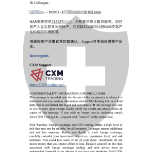 入金5000美金交易3天一共盈利800多美金8月30号晚上10点左右因CXM希盟出现问题导致我亏损400美金现在账户剩余5442美金我找他们要说法后来发现客户后台登录不上MT4也没禁用了还说我事什么违规交易现在交易记录和我的账户余额也看不到了他们也不给出金一直没有个说法