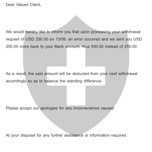 邮件中说明 在13/9月当天 出金250美金,但overpay给我。但是 我实际收到的也只有一笔也就是我提交的250usd ,没有500usd