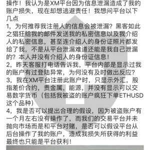 黑心的XM平台!我的账户251042680很久没有操作了,11月28号夜里2:37分(北京时间11月28号8:37分,突然被下了很多单子,很快就爆仓了!将近5601美金一下子就没有了!我严重怀疑我的密码被XM平台泄漏,XM平台是对赌平台,客户亏了就是他赚的。我反复和平台沟通此事,平台说是黑客盗取了密码,导致账户被做爆仓!就算黑客盗取了密码,难道XM没有责任吗?我要求XM还我被黑的钱!