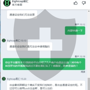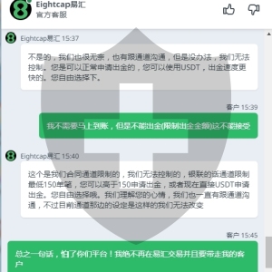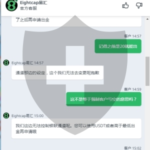 由于亏损的原因,亏剩下的钱被限制金额不足而不能出金!本来就亏损了,剩下来的还不能出金这是什么道理?客服的意思是可以先入金达到限额解除再出金!这分明不是疴屁解裤多此一举吗?为什么要这样弄?如果我没钱补充上去就不能出金这不是套路吗?原本就不能出金难道还敢往账户里面入金吗?惊!好惊!决定曝光!大家还敢往易汇里钻吗?有套路的平台你还敢玩吗?望有解决问题的可能吧!
