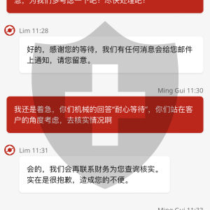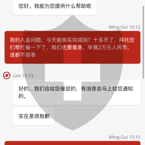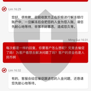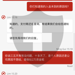 我3月17日入金2万元人民币,因入金金额与显示金额2000元人民币不相符,平台以此为理由拒绝到帐,二十天来多次沟通无果,至今未到帐,客服及邮件都机械式回复“正在查询,耐心等待”,20多天平台故意拖延不给