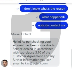 我在 OCtafx 交易超过 1 年。最近,他们以这个原因(sub-clause)3.10 暂停了我的帐户。 我不知道我做错了什么。他们不允许我提取所有辛苦赚来的钱。我从来没有从这个平台赚过一分钱。我总是继续充值。我的钱里面还有 35,000 美元。很生气,突然关闭了我所有的账户. 永远不要相信octafx 我不知道该怎么办。很无奈。没人能帮我