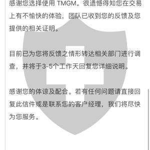 TMGM 回复澳大利亚您好,感谢您的来信,关于您的问题,请附上您所反馈的账号情况详情与订单细节,发送邮件至:mailto:support@tmgm.com官方客服邮箱。我们将进行调查并尽快给予回复。谢谢!