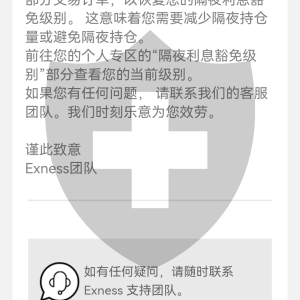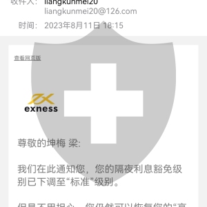 我与平台确认过,我是高级隔夜利息豁免级别权益,持仓过夜不收取隔夜利息的,在8月9日当晚,我追加资金,我持仓较多的黄金单,准备抄底。结果早上醒来一看浮亏不说(愿赌服输),但是exness居然翻面收取我3倍库存费。你们之前说好的不收取库存费,放心交易等等 。打脸exness自己吗?玩不起别玩!强烈要求返还收取我的3倍库存费348.32美元。