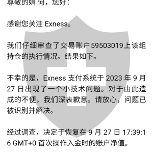 Exness 回复塞浦路斯您的赔偿申诉目前正在相关部门审核中,您将在接下来的五个工作日内收到回复。如果您有任何问题,请随时联系我们的24小时在线客服进行咨询。谢谢。