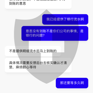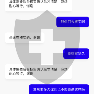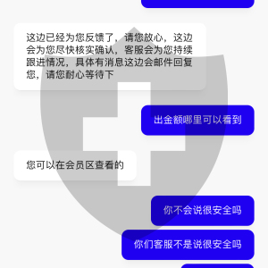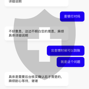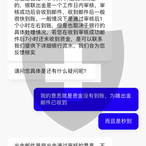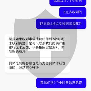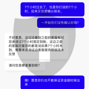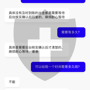 和客服沟通,他们就只会让我等,一会1个小时.1会要等7个小时,一会又说要1个工作日.问他们要等多久,他们也不知道,我也不知道问题出在哪里?感觉资金很不安全,大家最好不要玩这个