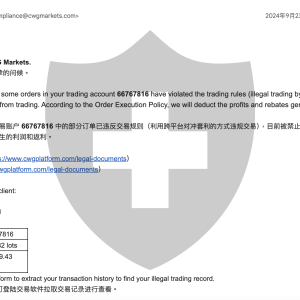 我在6/21入金10萬美金後開始交易,有獲利時出金也都沒問題,直到7/31要再申請出金時就不給出金了,打電話給相關人員就不斷的推託,直到9/23日CWG的交易部門寫信來才說我『違規交易』,沒有任何的舉證,然後把我在MT4裡面的34579.43金額給無理由移走。