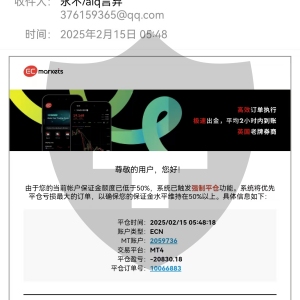 事情经过:2025年2月14日凌晨(2月15日早上5点45分临近停盘时间)ECmaarkets 安盈平台恶意提高点差,名点差为67点,暗点差48点,导致账户在多空双向锁仓的状态下,把我净值75万多USDT的账户一分钟内强平,没有任何的邮件通知,扮猪吃老虎的样子,太过于明目张胆,通过近一个月的时间和平台交涉,到至今只回复过一封邮件,让平台提供完整合规的解释强平依据,至今未得到回复,希望各大媒介朋友能够与我一起抵制“黑平台”的不正之风,账户是我本人的 我有全部的证据与资料,希望得到广大的媒介朋友的支持与转发,让更多的人知晓黑平台的违规操作。