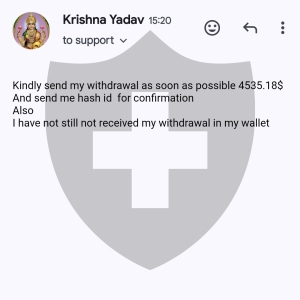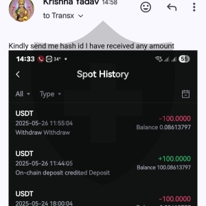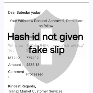 大家好,我是subedar yadav,我在transx市场交易开设了我的账户,账号为779545,与他们交易已经20天了,但当我申请提款时,他们还没有给我提款,也没有在邮件中回复,所以请封锁这种诈骗经纪商。我的总提款金额为4535.18美元。当我请求交易的哈希ID时,他们也没有回复,所以请封锁这家经纪商,拯救人们免受这种诈骗。