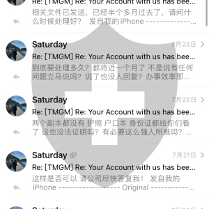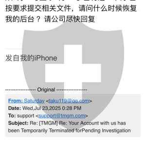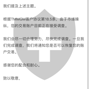 2025年6月9号,我在TMGM平台入金3000美金,使用跟单交易,随后的6月27号我的后台账户全部被暂时封停,至今没恢复!!之前也问过,平台是允许EA交易等其他跟单策略交易的,被封的很莫名其妙 好 那竟然封停了,那就解决问题 一开始跟平台发了无数的邮件,没人回应,客服也说是风控部的事情,无限甩锅,等了半个月终于有了封邮件,说要上传政府认证资料 好 资料上传 (上传了身份证 户口本 护照 )然后又是等,乌龟一样的效率 一等又是一周半个月。说要政府认证的公证副本,这些资料还无法证明吗?做公证副本的费用和时间精力你们平台来赔付吗?说有疑问立即联系你们 联系了也没人,这么大券商 实在搞不懂整这出 这样除了流失客户 给自己整黑料还有什么好处!!大家谨慎入金!!