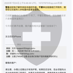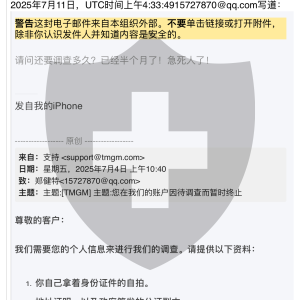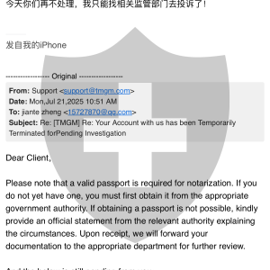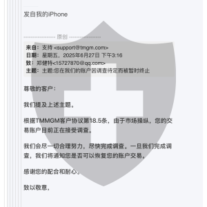 我于2025年4月30日在TMGM开户做交易,前后总计入金1万$,6月27日,TMGM以交易调查为由,直接封禁我的个人后台、账户(直接登陆不了那种,连本金都出不了),截止今天7月28日,违法占用我的本金一个多月!实际情况如下: