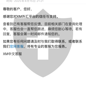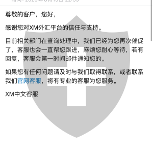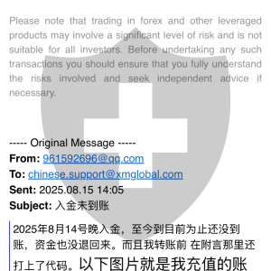 我在2025年8月14号晚上10点入金3000人民币,用银联转的账,转账入金XM平台的订单号是79107275。同时转账入金的过程中,我还在附言那里也打上了订单号的数字。我的MT5交易账号是68736317,目前为止今天8月18号,入金的金额没到账,资金也没原路返还给我,这几天时间问了3次XM平台的客服,包括也发了邮件给客服,统一的回复就是耐心等待,问什么时候能处理好,客服也没一个确切时间的回复