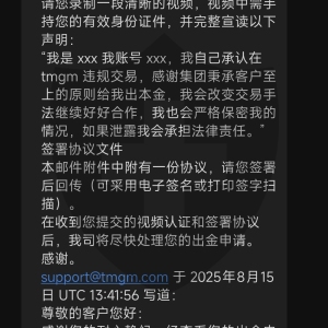 本人于在tmgm开户交易多年,2025年7月前后后入金超20wUSD,后续为了资金周转申请出金,但是平台卡着不让出金,随后在8月19日,发来邮件说本人进行了违规交易,未具体说明哪一个账号或者哪一个单号违规,并要求签署霸王条款,只出本金,且没有明确本金多少,只写了当天申请的一笔四千多的出金,严重不合理且强盗!!!