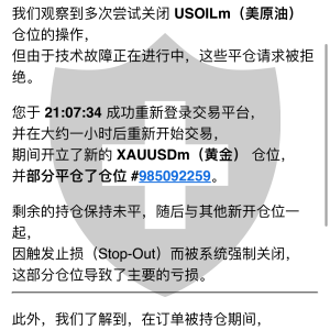 16晚上断网3个小时。手上持有1.5手多单。本来盈利500美金。等连接网线 变亏损。最终保存。平台不负责。说我还有操作权限 都连接不上怎么平仓